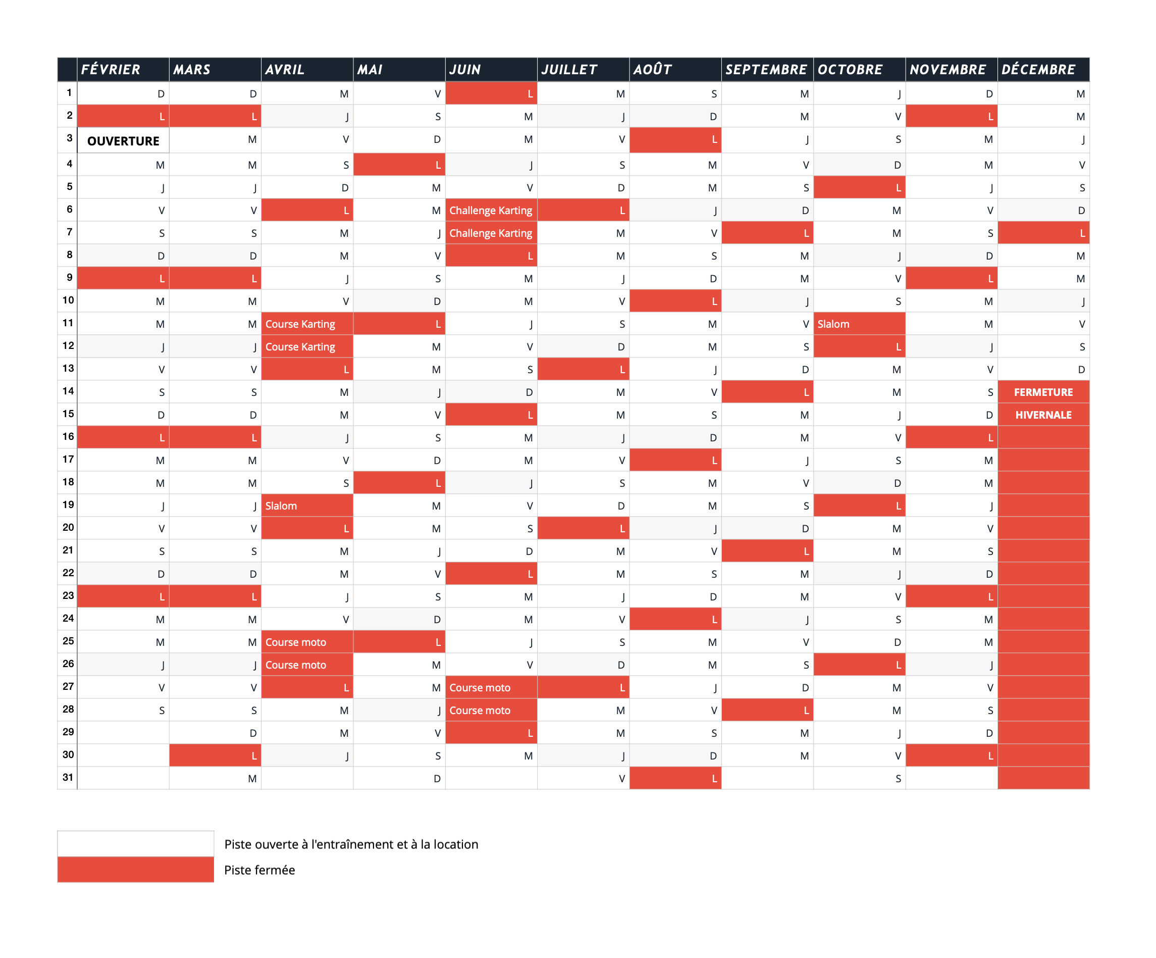 L’entraînement pour la compétition n’est pas possible le dimanche après-midi. La piste est ouverte à l’entrainement de 10H à 12H30 uniquement.